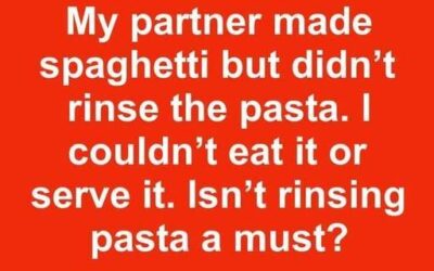 My partner cooked spaghetti but skipped rinsing the noodles. I couldn’t bring myself to eat it or offer it to anyone else. Isn’t rinsing pasta something you’re supposed to do?