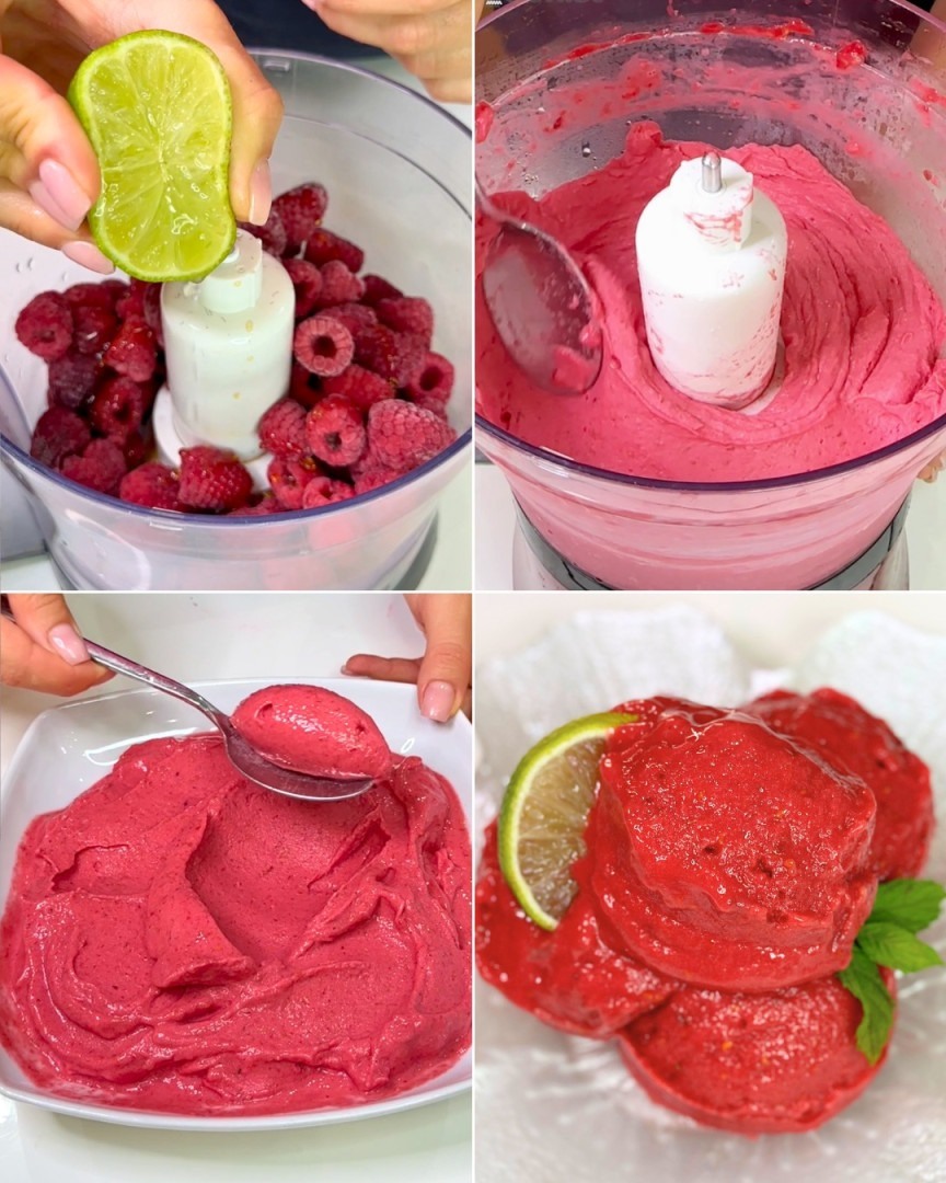 To make it, simply blend all the ingredients in a blender and the raspberry sorbet is ready: our Melissa served it simply with a slice of lime and a few mint leaves, but you can serve it however you like.