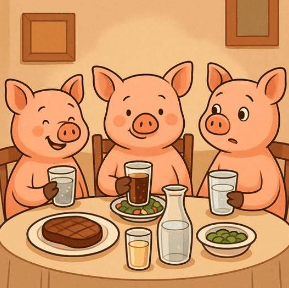 When the waiter finally questions the third pig’s strange fixation on water, the punchline cleverly twists a childhood rhyme into a literal explanation. The pig’s need to “wee-wee-wee all the way home” transforms a familiar phrase into a physical necessity, creating humor through playful reinterpretation and unexpected logic.