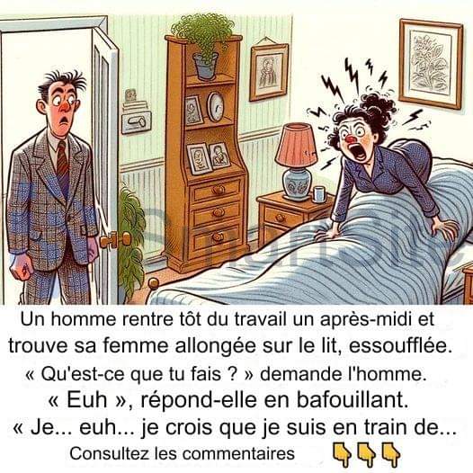 Un homme rentre tôt du travail un après-midi et trouve sa femme étendue sur le lit, essoufflée et haletante.